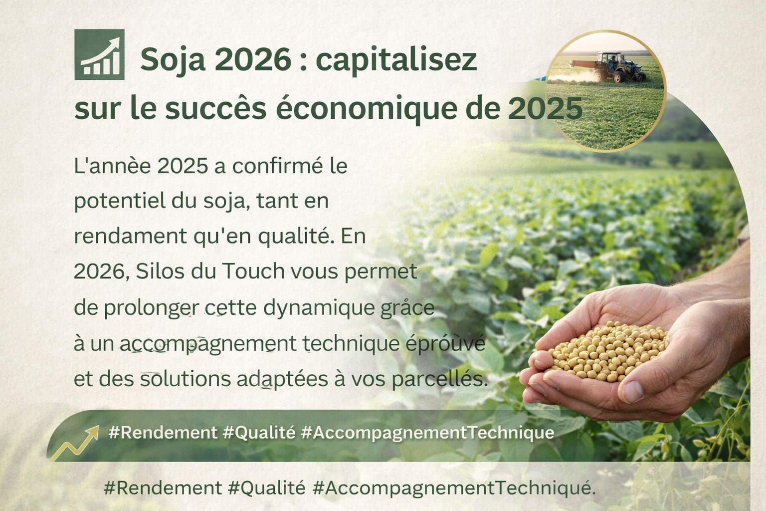 L’année 2025 a prouvé que le soja est une culture à fort potentiel. 👉 En 2026, tout est réuni pour aller encore plus loin. 📈 Un succès déjà confirmé Rendements solides, qualité au rendez-vous : 2025 a démontré que le soja est une valeur sûre pour les producteurs. ➡️ Une base idéale pour sécuriser et développer vos performances en 2026. ⚙️ Un accompagnement qui fait la différence Avec Silos du Touch, vous bénéficiez : ➡️ d’un accompagnement technique éprouvé ➡️ de solutions adaptées à vos parcelles ➡️ d’un suivi pensé pour optimiser chaque étape de la culture 🌿 🌾 Des perspectives concrètes pour 2026 Capitaliser sur l’expérience de 2025, c’est : • mieux maîtriser les itinéraires techniques • améliorer la régularité des rendements • sécuriser la qualité de la production 🔥 En résumé : 2026 est l’année pour transformer le potentiel du soja en performance durable. Et vous, êtes-vous prêt à capitaliser sur cette dynamique ? 🚜✨ #Soja2026 #Agriculture #Cultures #InnovationAgricole #PerformanceAgricole #Rendement #AccompagnementTechnique #ProductionVégétale #SilosDuTouch #AgricultureDurable #FilièreSoja