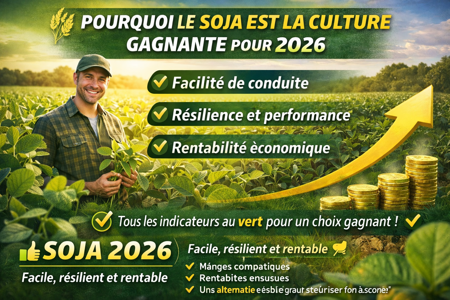 Voici pourquoi ce choix s’impose 👇 🌱 Une culture facile à conduire Le soja est reconnu pour sa simplicité : ➡️ itinéraire technique maîtrisé ➡️ conduite accessible ➡️ adaptation à différents contextes 💪 Résilience et sécurité En 2025, le soja a prouvé sa solidité : ➡️ bonne résistance face à des conditions parfois difficiles ➡️ performances supérieures à d’autres cultures, notamment le maïs 💶 Un choix économiquement performant ➡️ marges compétitives ➡️ rentabilité sécurisée ➡️ une alternative solide pour ton assolement 🔥 En résumé : En 2026, le soja s’impose comme une culture fiable, rentable et stratégique 🌱 👉 Et toi, le soja fera-t-il partie de tes choix cette saison ? 🌾 #Soja2026 #CultureGagnante #Agriculture #Assolement #PerformanceAgricole #Rentabilité #Résilience #Cultures #StratégieAgricole #AlternativesAuMaïs #ProductionVégétale