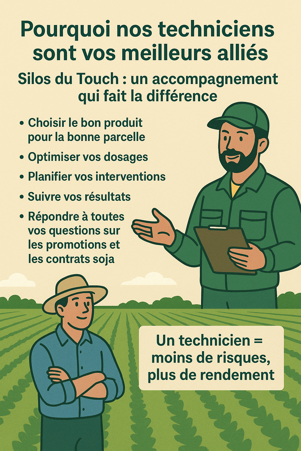 Les chiffres parlent d’eux-mêmes : 👉 Un accompagnement technique adapté peut faire toute la différence sur ta parcelle 🌾 Voici comment 👇 👨🌾 Un technicien à tes côtés Nos experts t’aident à : . Choisir le bon produit pour la bonne parcelle . Optimiser tes dosages pour plus de rendement 💧 . Planifier tes interventions efficacement . Suivre tes résultats pas à pas 📊 . Répondre à toutes tes questions sur les promotions et contrats soja ⚙️ Moins de risques, plus de performance Un technicien = moins de pertes, plus de rendement, et une culture de soja réussie. 💡 Avec Silos du Touch, ton soja devient rentable, durable et performant. 🔥 En résumé : Un technicien compétent, c’est ton meilleur allié pour booster la rentabilité, la résilience climatique et la production durable. Et toi, es-tu prêt à profiter de l’expertise Silos du Touch pour tes parcelles en 2026 ? 🌱 #Soja #Agriculture #AgriConseil #CultureDurable #TechnicienAgricole #Rentabilité #Agroécologie #PerformanceDesCultures #AgriInnovation