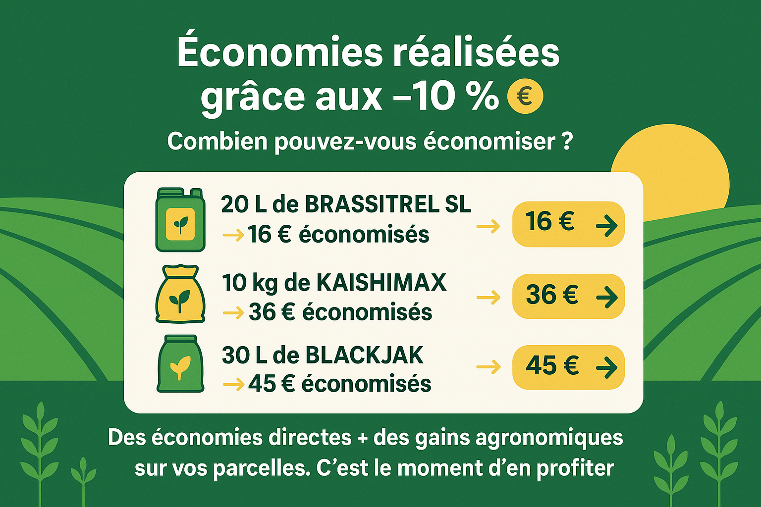 Regarde ça 👇 💶 Des économies concrètes Avec -10 % sur nos produits phares, ton budget agricole respire ! ➡️ Moins de dépenses, plus de marge, plus de liberté pour investir ailleurs. 📊 Exemple concret : • 20 L de BRASSITREL SL → 16 € économisés • 10 kg de KAISHIMAX → 36 € économisés • 30 L de BLACKJAK → 45 € économisés ⚙️ Des gains pour tes cultures Ces produits ne se contentent pas de te faire économiser : ➡️ ils améliorent la fertilité du sol, boostent la protection de tes plantes et optimisent tes rendements 🌱 🔥 En résumé : Profiter des promotions, c’est un choix malin, économique et agronomique ! Et toi, tu comptes en profiter pour la prochaine saison ? 🌿 #Agriculture #ProduitsAgricoles #Économies #Fertilisation #ProtectionDesCultures #Rendement #Agroécologie #AgriConseil #PromoAgricole